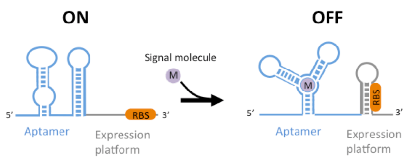 Riboswitches work as RNA control elements that bind to a specific metabolite and once the RNA-metabolite interaction is done, the RNA structure changes to a new configuration, therefore influencing the transcription or translation of the gene. In this type of sensing mechanisms no direct interaction of a protein is observed, showing a complete different level of sensing and control.